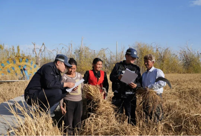 十月的新疆温宿,正值秋收关键时期,广袤的田野上,处处是群众抢收麦子的忙碌身影。“白天家里基本没人,传统的入户宣传效果会打折扣。”托乎拉乡派出所所长柳申坤介绍。面对这一实际情况,民警迅速调整工作思路,变“等群众回来”为“到群众中去”,决定利用农户劳作间隙,将安全知识直接送到田间地头。