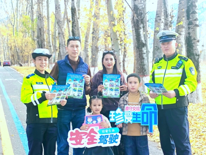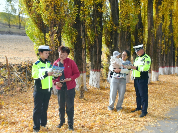 金秋十月,伊犁植物园内层林尽染,网红公路沿线落叶铺金,吸引众多游客前来打卡。10月25日,新源县公安局交警大队民警走进这一秋日胜景,开展了一场沉浸式交通安全宣传活动,让安全知识随秋意浸润游客心田。