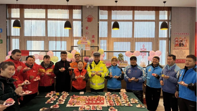 11月14日,克拉玛依区总工会“驿”路同行生日同庆活动现场暖意融融。克拉玛依市公安局交通管理支队克拉玛依区大队紧跟外卖配送行业需求,为在场过生日的外卖骑手宣讲交通安全,送上安全祝福。