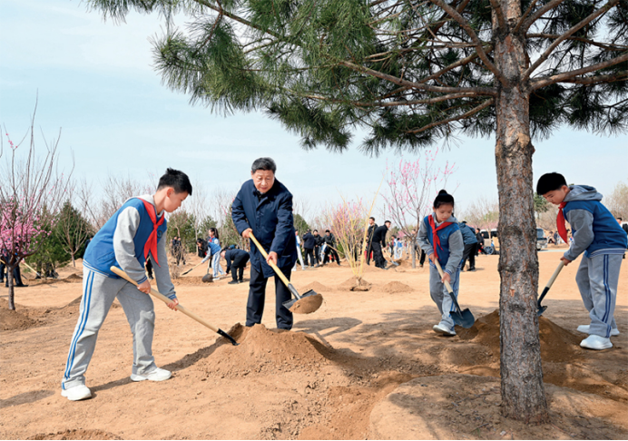 2025年4月3日,党和国家领导人习近平、李强、赵乐际、王沪宁、蔡奇、丁薛祥、李希、韩正等来到北京市丰台区永定河畔参加首都义务植树活动。这是习近平同大家一起植树。新华社记者 谢环驰/摄