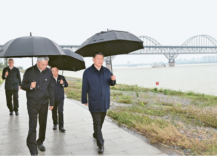 2023年10月10日至13日,中共中央总书记、国家主席、中央军委主席习近平在江西考察。这是10日下午,习近平在长江国家文化公园九江城区段考察时,冒雨沿江堤步行察看沿岸风貌。新华社记者 谢环驰/摄
