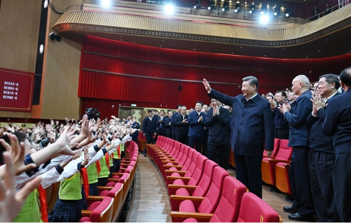 王沪宁、蔡奇、李干杰、何立峰、王小洪、雪克来提·扎克尔、谌贻琴、王东峰和刘振立,在新疆工作过的老同志,以及中央和国家机关有关部门负责同志、中央代表团全体成员一同观看演出。