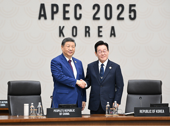 当地时间11月1日上午,国家主席习近平出席亚太经合组织第三十二次领导人非正式会议东道主交接环节,宣布中方将于明年11月在广东省深圳市举办亚太经合组织第三十三次领导人非正式会议。这是习近平同韩国总统李在明在交接环节上握手。新华社记者 谢环驰 摄