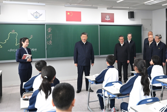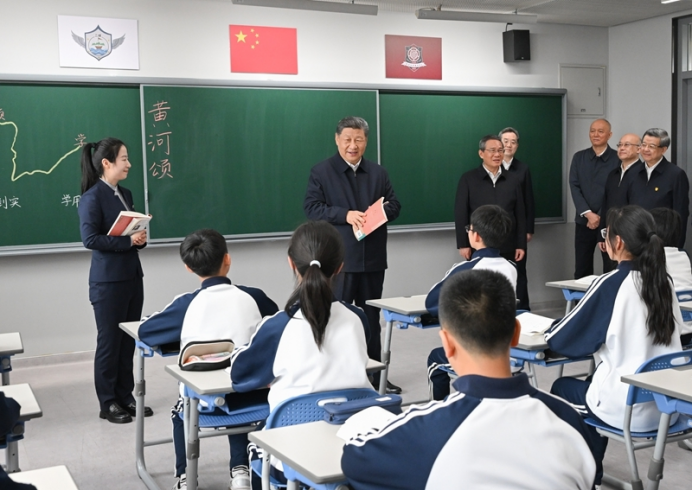 3月23日,中共中央总书记、国家主席、中央军委主席习近平在河北雄安新区考察,并主持召开深入推进雄安新区高质量建设和发展座谈会。这是23日上午,习近平在北京四中雄安校区考察时,走进教室同师生亲切交谈。新华社发(盛佳鹏 摄)