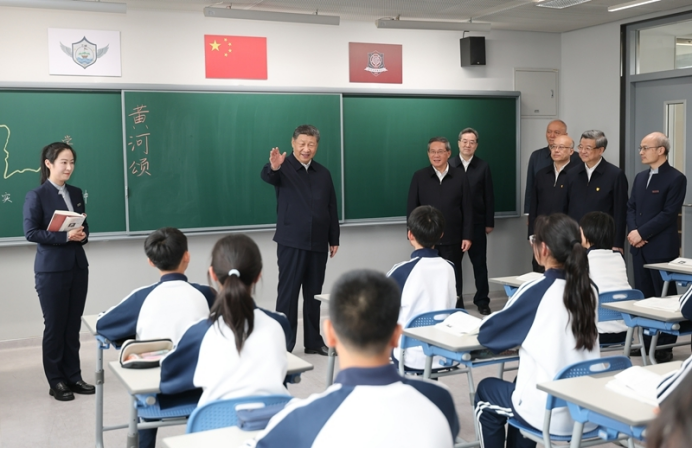 在学校食堂,习近平察看就餐环境、菜品种类等,叮嘱一定要确保学生饮食的安全和营养。离开学校时,师生们一齐向总书记问好,习近平勉励孩子们惜福奋进、积极向上,与雄安新区一起成长,与中国式现代化同步发展。