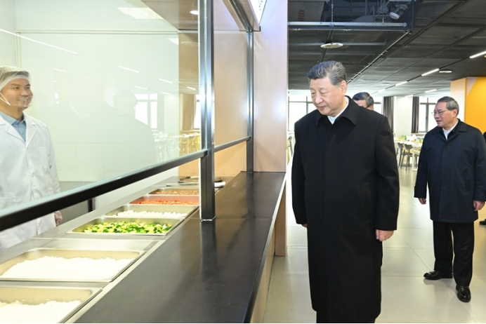 3月23日,中共中央总书记、国家主席、中央军委主席习近平在河北雄安新区考察,并主持召开深入推进雄安新区高质量建设和发展座谈会。这是23日上午,习近平在北京四中雄安校区食堂考察。新华社记者 燕雁 摄