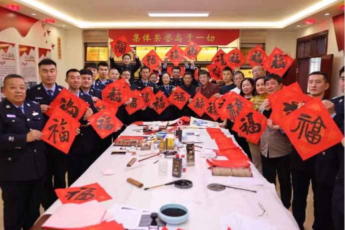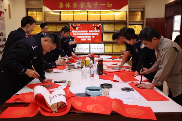 现场的民辅警或驻足观赏书法、国画创作的精妙过程,或轻声交流对春联词句的感悟,现场氛围热烈而温馨,火红的春联与藏蓝的警服相互映衬,构成了警营中一道独特而温暖的风景线。