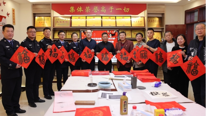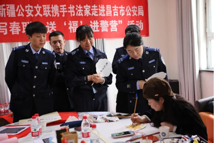 为进一步深化警营文化建设,在2026年新春即将来临之际,新疆维吾尔自治区公安厅政治部、新疆公安文联携手丝路书画院书法家走进昌吉市公安局三工镇派出所开展“万福迎春写春联—送‘福’进警营”活动,以笔墨为媒,为坚守岗位的民警辅警送上浓浓的新春祝福和文化滋养。