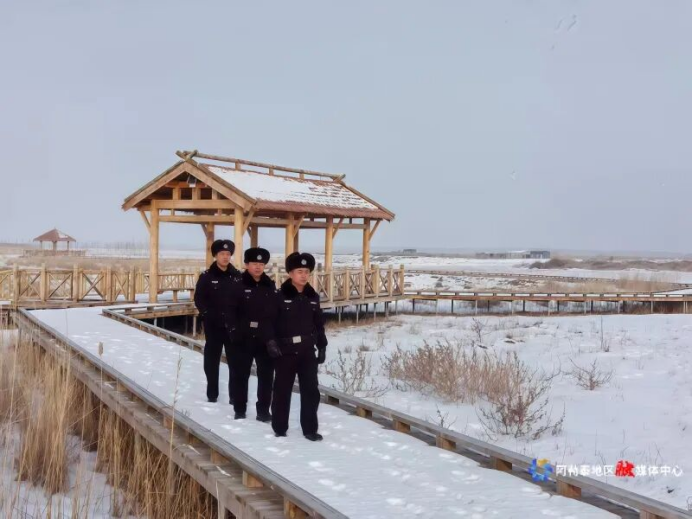 阿勒泰市公安局阿拉哈克镇派出所民警在科克苏湿地国家级自然保护区开展步巡工作。