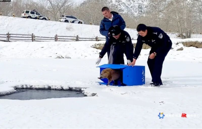 青河县公安局生态警务站民警与保护区工作人员合力放归康复的蒙新河狸。