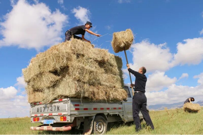2025年10月12日,和布克赛尔蒙古自治县公安局民辅警协助牧民打草装车、顺利转场。通讯员 周章惠 摄