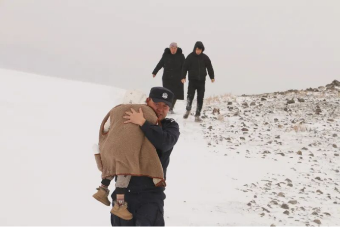 3月11日,遭遇大风恶劣天气,牧道路面结冰,能见度较低,一对带着孩子的牧民夫妇被困途中,随行牛羊无人看管。与此同时,民警还接到报警,称另一名发高烧的牧民也被困在这一路段。
