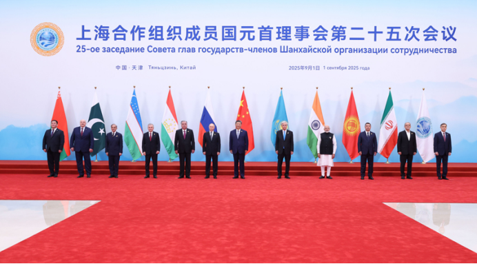 9月1日上午,上海合作组织成员国元首理事会第二十五次会议在天津梅江会展中心举行。中国国家主席习近平主持会议并发表题为《牢记初心使命 开创美好未来》的重要讲话。这是习近平同出席会议的上海合作组织成员国领导人、常设机构负责人集体合影。新华社记者 黄敬文 摄