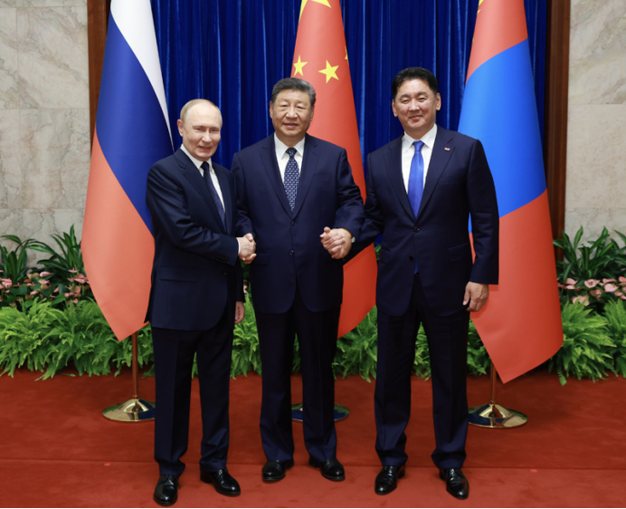 9月2日上午,国家主席习近平同俄罗斯总统普京、蒙古国总统呼日勒苏赫在北京人民大会堂举行中俄蒙三国元首第七次会晤。新华社记者 丁海涛 摄