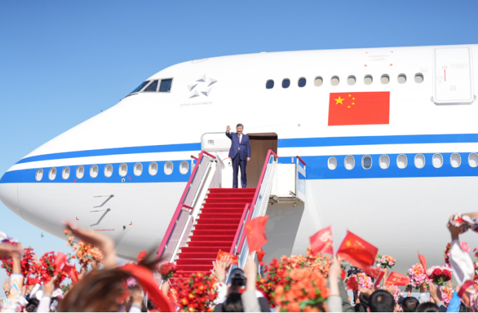中共中央总书记、国家主席、中央军委主席习近平在乌鲁木齐出席新疆维吾尔自治区成立70周年庆祝活动后,9月25日中午乘专机返回北京。这是习近平在乌鲁木齐天山国际机场向前来欢送的各族群众挥手致意。新华社记者 申宏 摄
