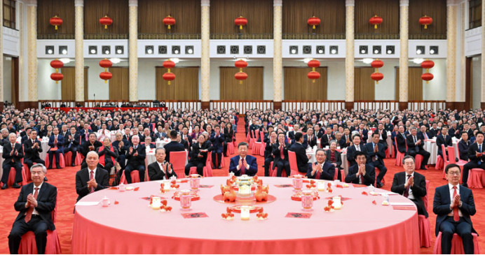 人民大会堂宴会厅灯光璀璨、喜气洋洋,各界人士2000多人欢聚一堂、共迎佳节,现场洋溢着欢乐祥和的节日气氛。